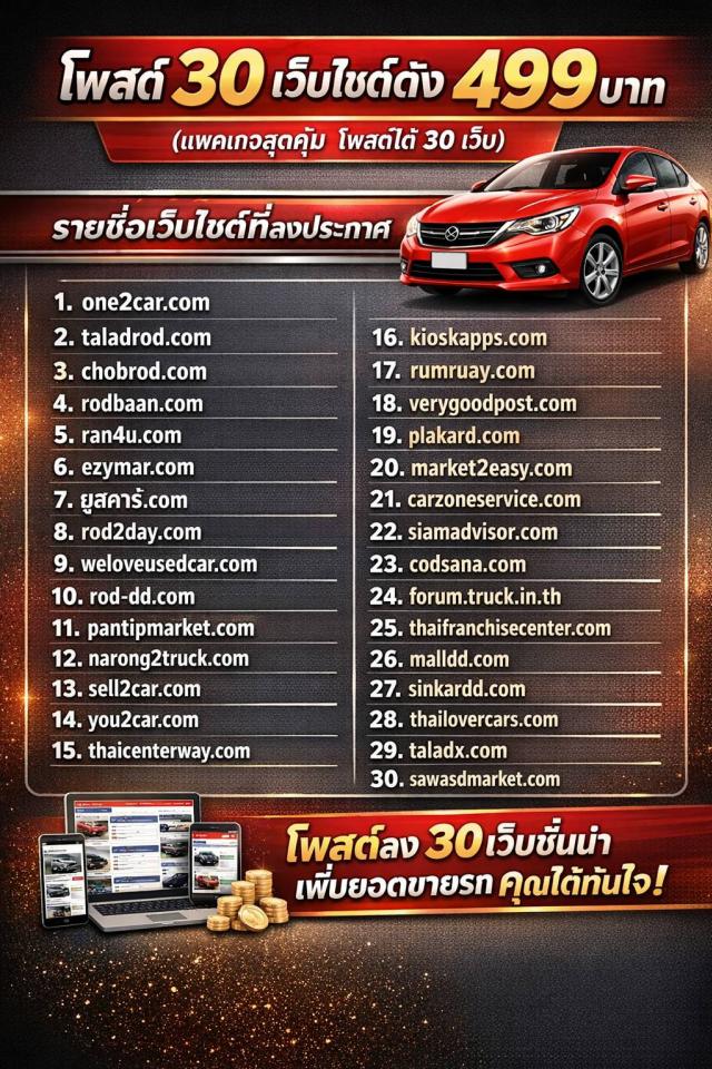 แพ็กเกจ A 499 บาท • โพสต์ 30 เว็บรถชั้นนำ เช่น one2car, chobrod, taladrod เหมาะกับผู้ต้องการขายรถ งบจำกัด