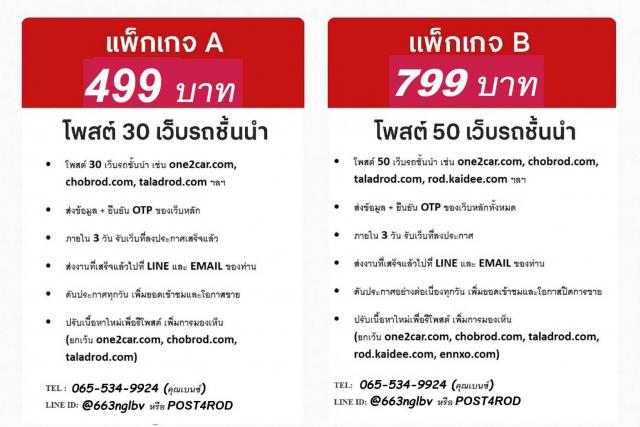 แพ็กเกจ A 499 บาท • โพสต์ 30 เว็บรถชั้นนำ เช่น one2car, chobrod, taladrod เหมาะกับผู้ต้องการขายรถ งบจำกัด