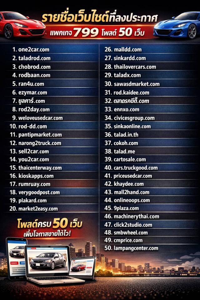 แพ็กเกจ A 799 บาท • โพสต์ 50 เว็บรถชั้นนำ เพิ่มโอกาสขายยิ่งขึ้น